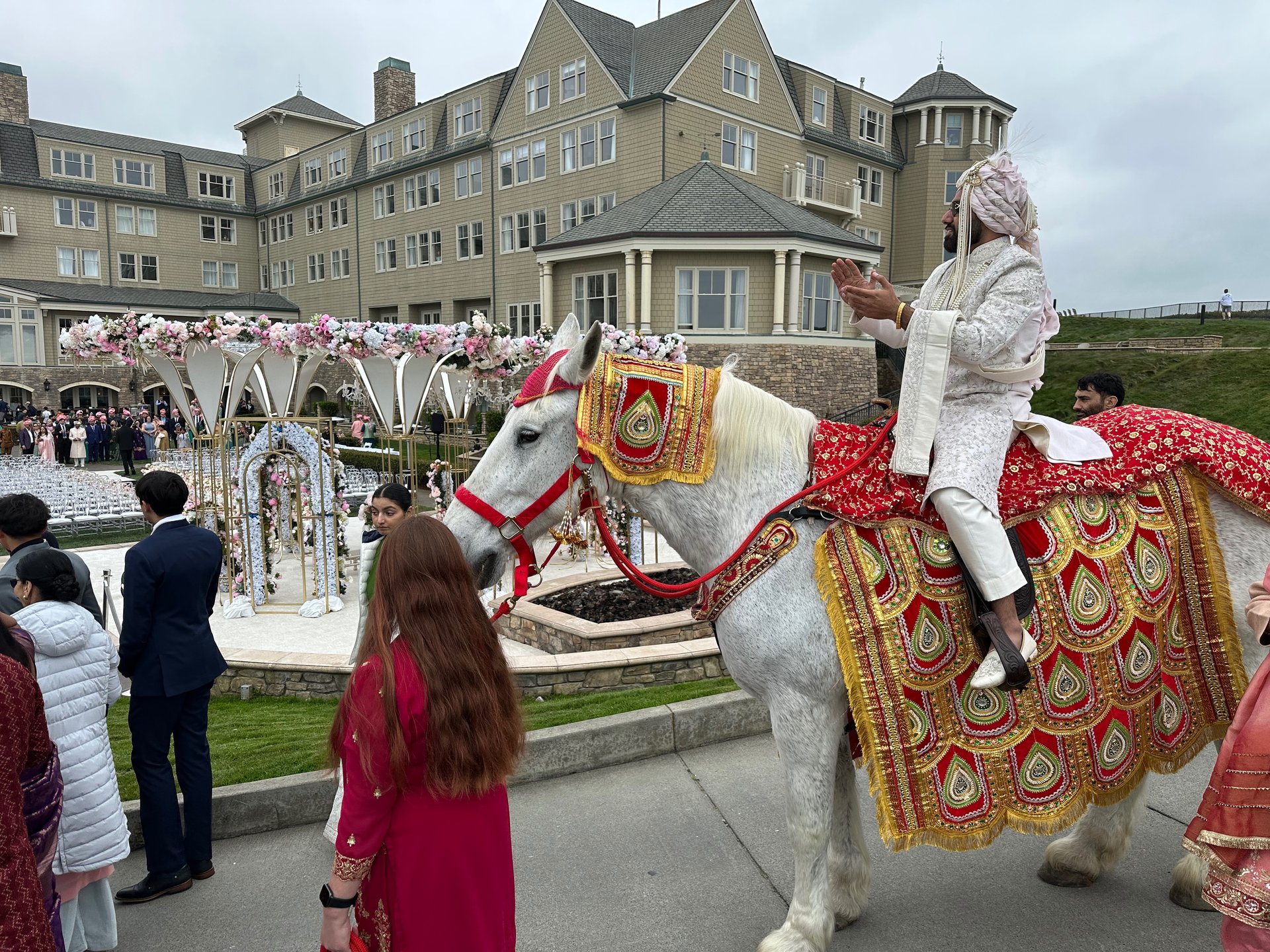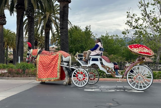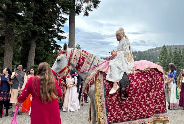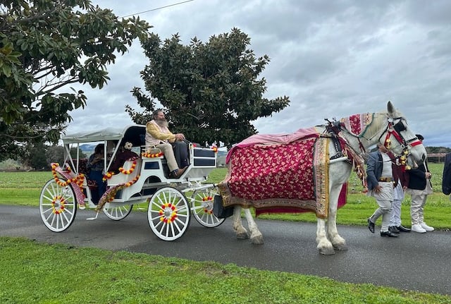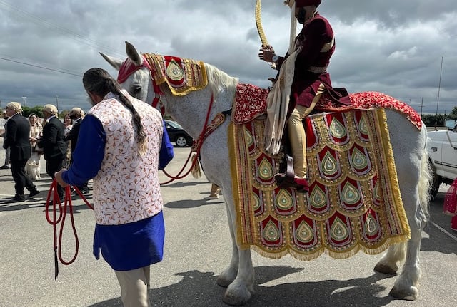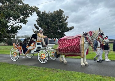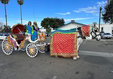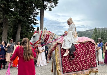 A Baraat Horse in decoration to be ridden by the bridegroom is $1,000.00 for the first hour and a half from scheduled start time. We have a travel fee of $6.00 per mile one way. Our prep time is included in the pricing. Additional time with the horse is $250.00 per hour.