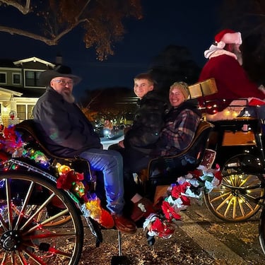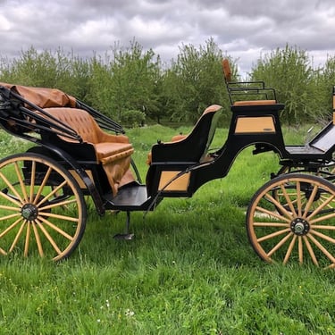 Our 2014 Black and Tan Robert Vis-a-Vis carriage seats up to 4 adults and 2 elementary aged children. The seats are 41 inches wide. It is black with tan vinyl seats. Vis-a-Vis means face to face as the passengers sit facing each other. This carriage is mostly used for our Fab 40’s and other holiday carriage rides.