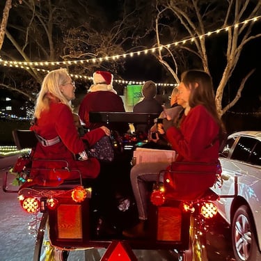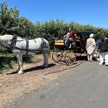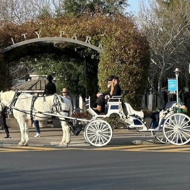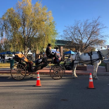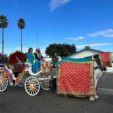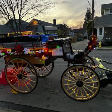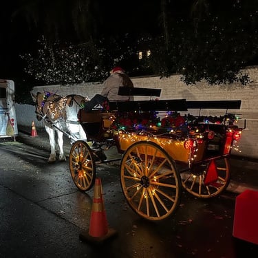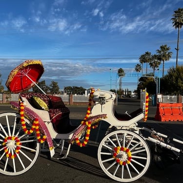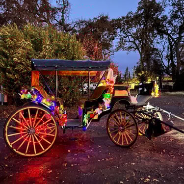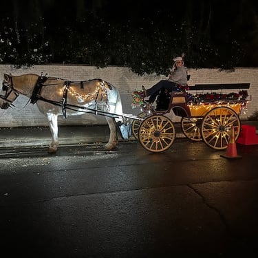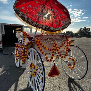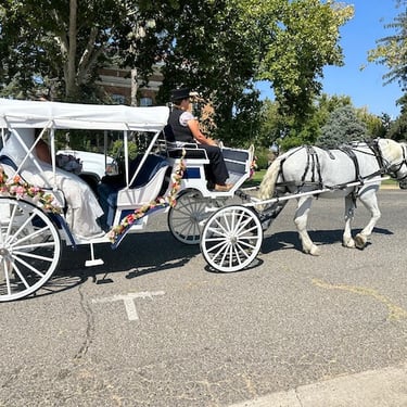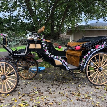 We have a verity of horses carriages, each one is a little different from the other. We love to decorate our carriages with fender covers that we pin flowers onto. The fender covers also have reflective tape to help us be seen better at night. All of our carriages have breaks, brake lights, hazard lights, caution triangle, turn signals, headlights and fog lights to light up the horse.