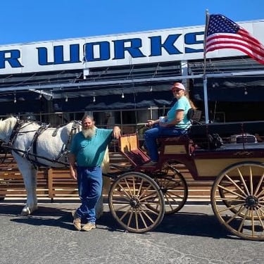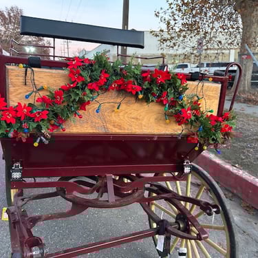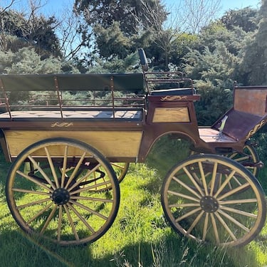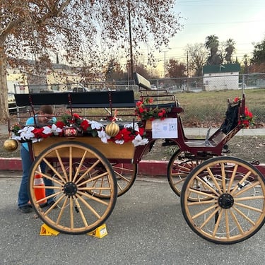 Our Burgundy and Tan Robert Wagonette seats up to 6 adults and 4 elementary aged children. It is burgundy and tan with tan vinyl seats. This carriage is mostly used for our Fab 40’s and other holiday carriage rides.
