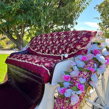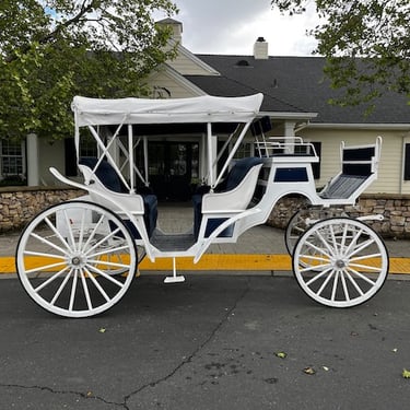 The white Robert Vis-a-Vis is approximately 40 years old and seats up to 4 adults and 2 elementary aged children. The seats are 41 inches wide. It is white with royal blue velvet seats. Vis-a-Vis means face to face as the passengers sit facing each other.