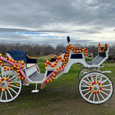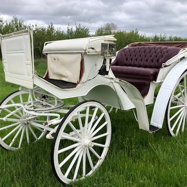 Our smallest carriage is our Troyer carriage that seats 2. We are not sure how old the carriage really is. It is a white with maroon vinyl seats. It is our most requested carriage. We have a verity of seat covers, fender covers and flowers to decorate it.