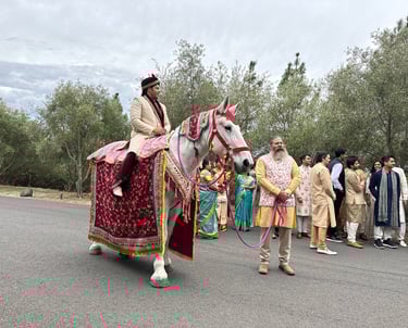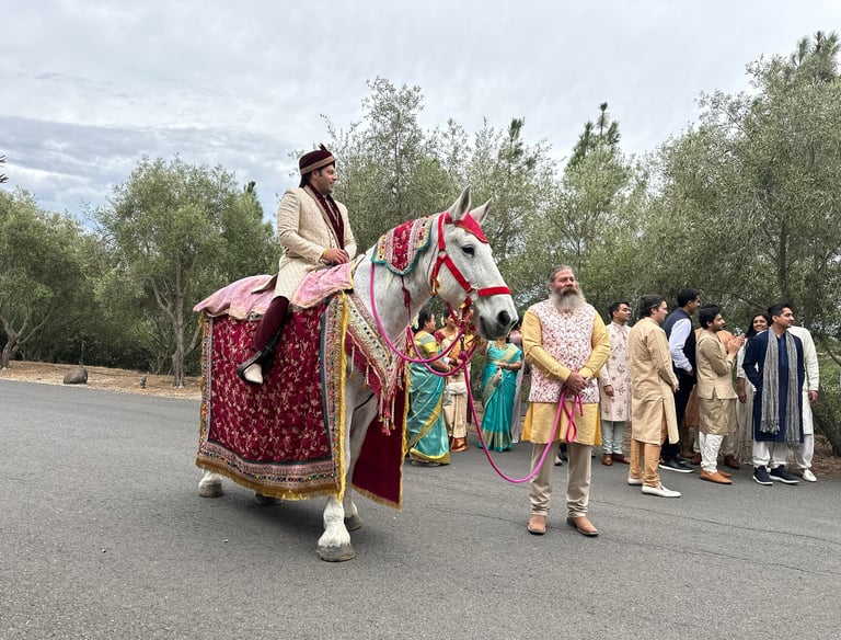 A Baraat Horse in decoration to be ridden by the bridegroom is $1,000.00 for the first hour and a half from scheduled start time. We have a travel fee of $6.00 per mile one way. Our prep time is included in the pricing. Additional time with the horse is $250.00 per hour.
